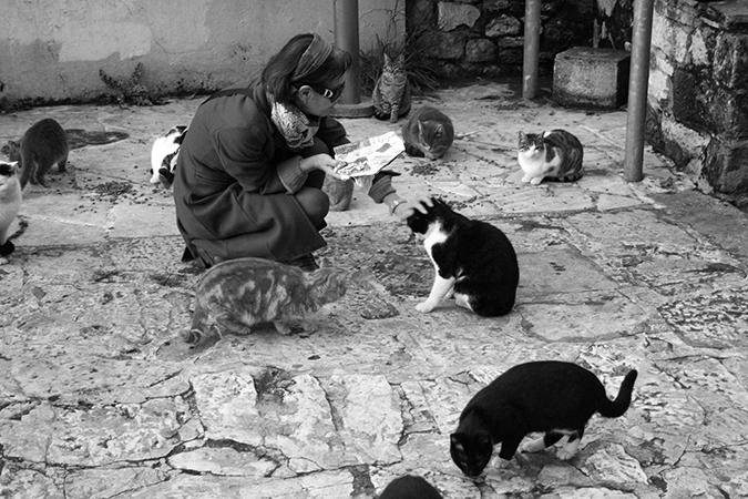 4 Περαστική ταίζει τις γάτες μιας γειτονιάς στην Πλάκα.