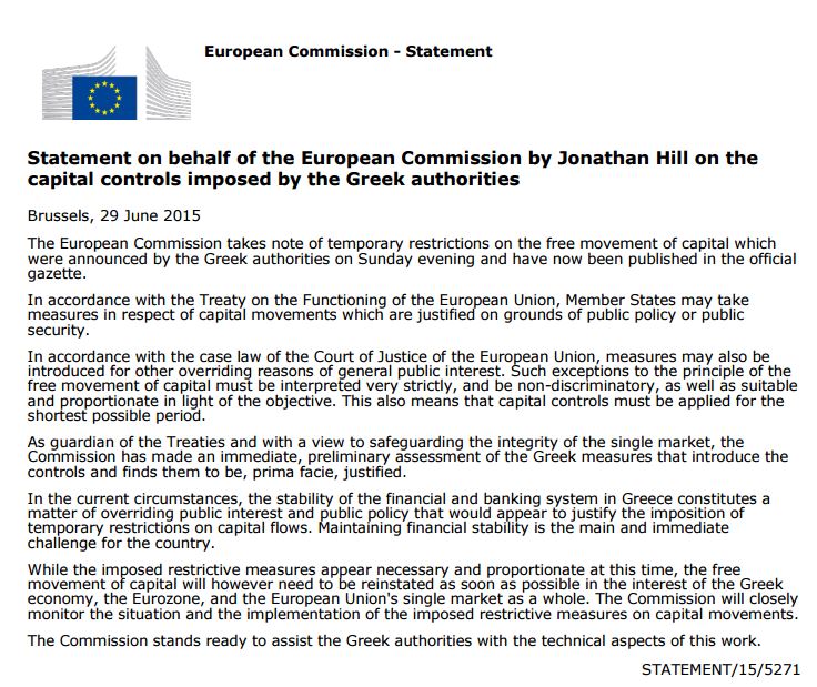 Ενώ τα επιβληθέντα περιοριστικά μέτρα εμφανίζονται αναγκαία και αναλογικά αυτή τη στιγμή, η ελεύθερη κίνηση κεφαλαίου ωστόσο θα χρειαστεί να αποκατασταθεί το συντομότερο δυνατό προς όφελος της ελληνικής οικονομίας, της ευρωζώνης, και της ενιαίας αγοράς της Ευρωπαϊκής Ένωσης στο σύνολό της. Η Κομισιόν θα παρακολουθεί στενά την κατάσταση και την εφαρμογή των επιβληθέντων περιοριστικών μέτρων σχετικά με τις κινήσεις κεφαλαίων.