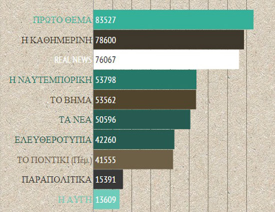 Στην έκτη θέση βρίσκεται η εφημερίδα τα Νέα, στην έβδομη θέση η Ελευθεροτυπία, στην όγδοη το Ποντίκι, στην ένατη τα Παραπολιτικά και στη δέκατη η Αυγή.