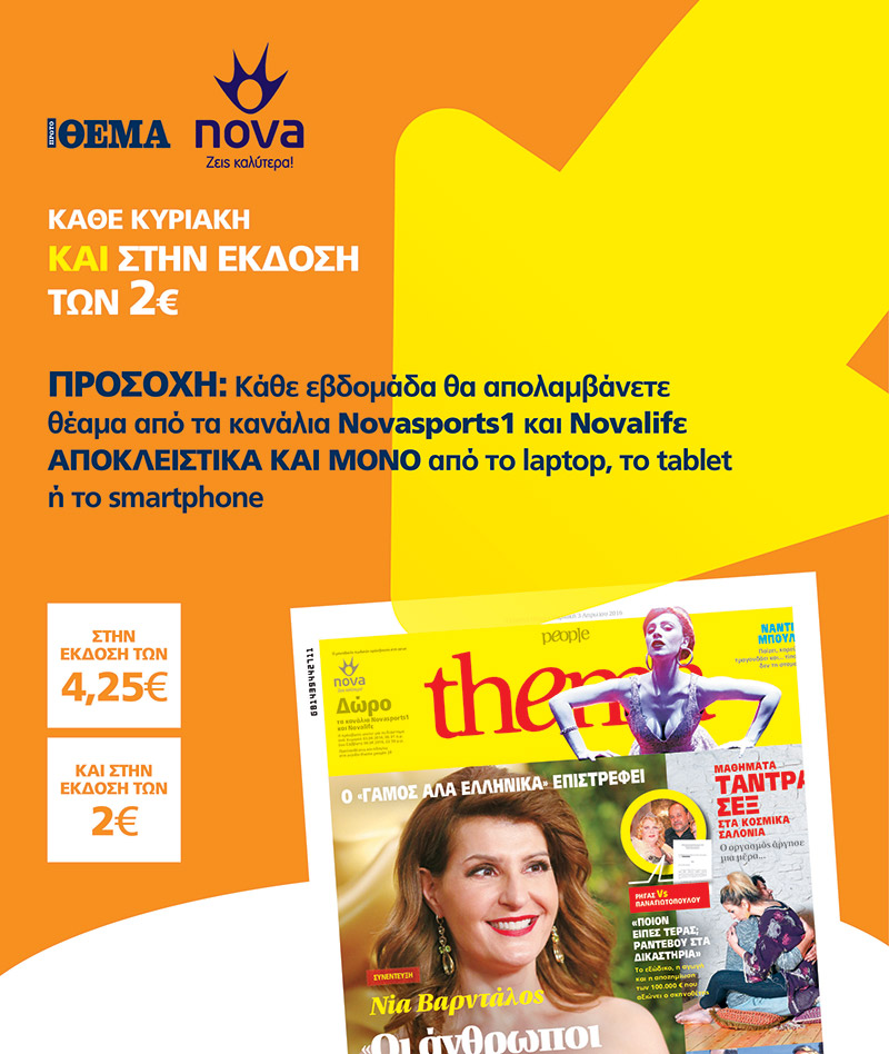 Στείλτε SMS στο 19129 (χρέωση 0,09€ + ΦΠΑ ανά SMS) με το εξής περιεχόμενο: Thema κενό, μοναδικός κωδικός πρόσβασης που βλέπετε στο πάνω μέρος της πρώτης σελίδας του “thema people”και θα λάβετε απαντητικό SMS µε το όνομα χρήστη και τον κωδικό της υπηρεσίας Nova GO.