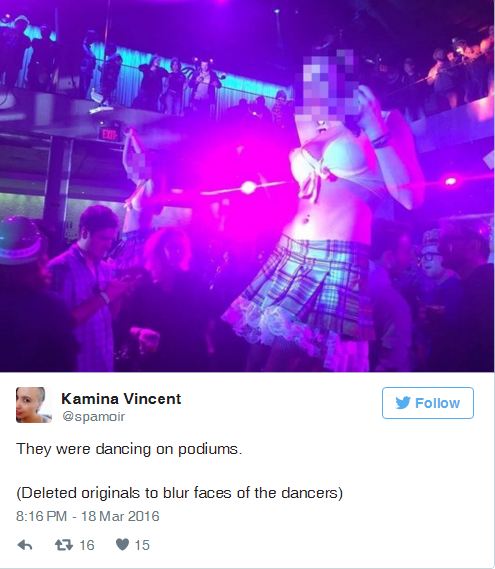 Σύμφωνα με την εφημερίδα "Independent", η Καμίνα Βίνσεντ ήταν αυτή που πρώτη γνωστοποίησε στο Twitter το κλίμα που επικρατούσε στην εκδήλωση εκφράζοντας την οργή της για το θέαμα. "Οι χορεύτριες που προσλήφθηκαν ήταν άμεσα αντιληπτές γιατί ξεχώριζαν εύκολα από τα ρούχα τους τα οποία ήταν τελείως διαφορετικά από των υπολοίπων. Φορούσαν ένα κολλητό μπλουζάκι που άφηνε ακάλυπτη την κοιλιά τους και πολύ κοντές φούστες", δήλωσε η ίδια και πρόσθεσε: "Μία μάλιστα μου συστήθηκε και με ρώτησε εάν διασκέδαζα. Εγώ την ρώτησα ποιος ήταν ο ρόλος της στο πάρτι. Μου είπε ότι την είχαν προσλάβει για να μιλάει στους παρευρισκόμενους και να τους ενθαρρύνει να χορέψουν. Όταν όμως συνέχισα να την ρωτάω σχετικά με την παρουσία και τον ρόλο της στο πάρτι, τότε μου ζήτησε συγγνώμη γιατί έπρεπε λέει να φύγει. Μετά πήγε σε μία παρέα ανδρών που καθόταν σε διπλανό καναπέ. Αυτή η συζήτηση με έκανε να αισθανθώ πολύ άβολα και τότε αποφάσισα να φύγω από το πάρτι".