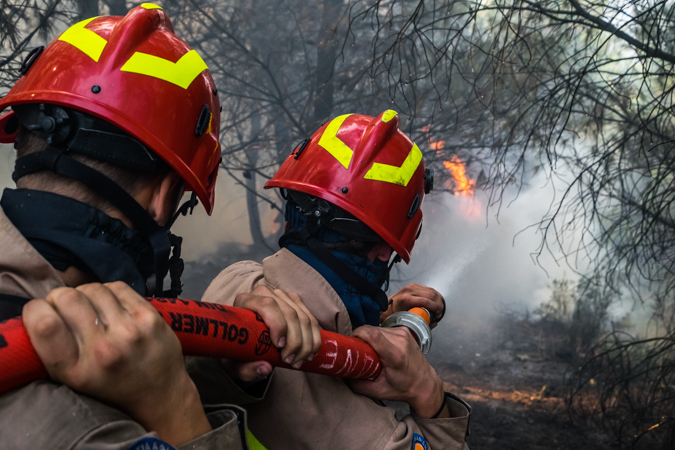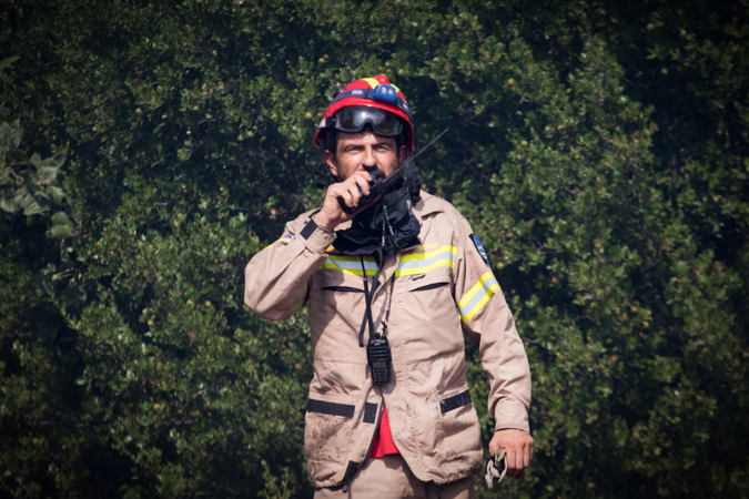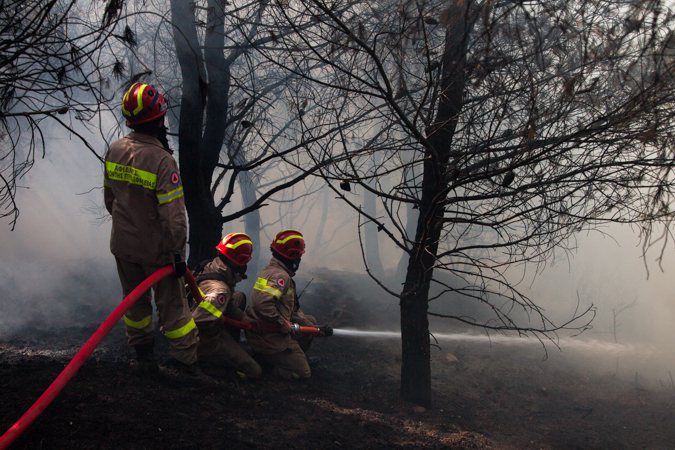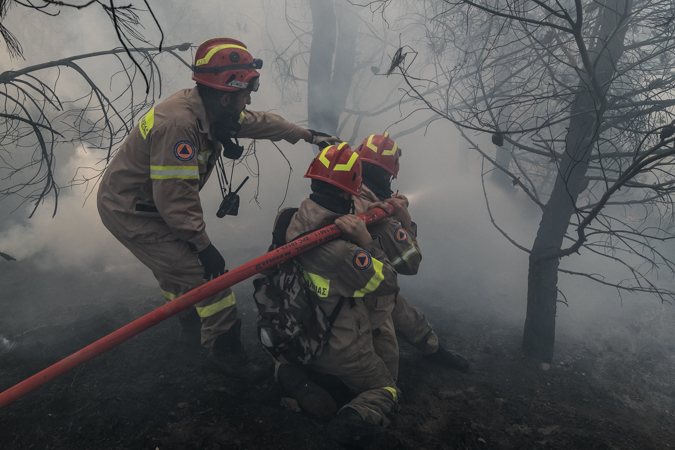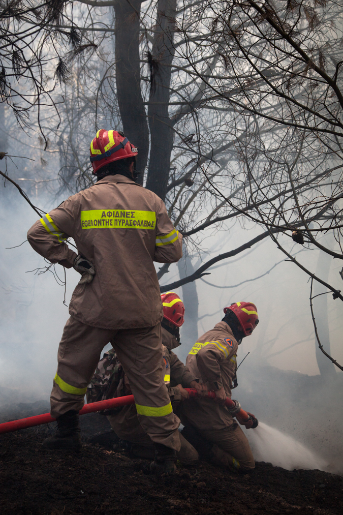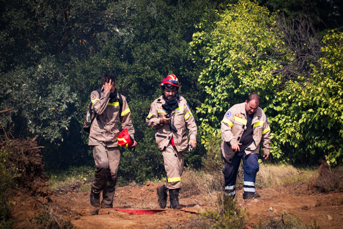 Φωτογραφίζουμε από ένα ξέφωτο την έκταση της όταν ξαφνικά, φλόγες ξεπροβάλουν μπροστά μας από μια αναζωπύρωση η οποία απειλούσε άμεσα κατοικίες. Μέσα στην αναστάτωση εμφανίστηκαν δυο οχήματα και μια ομάδα αεικίνητων ανθρώπων άρχισαν να ξεδιπλώνουν μάνικες και να δημιουργούν εγκατάσταση σε χρόνο ρεκόρ. Αμέσως κάποιοι από αυτούς χάθηκαν στις καιγόμενες φυλλωσιές, ενώ άλλοι έτρεξαν περιμετρικά της κορυφογραμμής, με τις μάνικες στα χέρια. Χωρίς δεύτερη σκέψη τους ακολουθήσαμε για να καταγράψουμε την προσπάθεια τους.