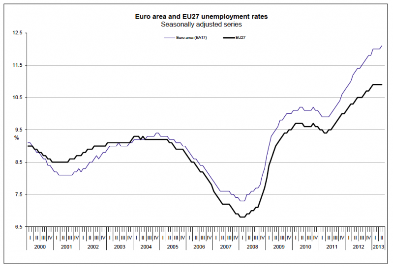 Όπως ανακοίνωσε η ευρωπαϊκή στατιστική υπηρεσία, τον Μάιο του 2013 οι άνεργοι νέοι (κάτω των 25 ετών) στην Ε.Ε. ανήλθαν σε 5,501 εκατομμύρια, εκ των οποίων τα 3,531 εκατομμύρια αφορούν στην Ευρωζώνη.