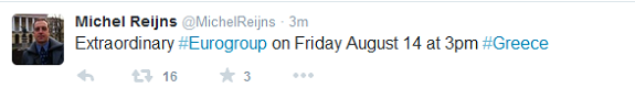 Σύμφωνα, λοιπόν, με την ανάρτησή του οι υπουργοί Οικονομικών της Ευρωζώνης θα συνεδριάσουν εκτάκτως την Παρασκευή, 14 Αυγούστου, στις 15.00 (ώρα Βρυξελλών), για το ζήτημα της Ελλάδας και τη σύναψη της νέας συμφωνίας με τους πιστωτές.
