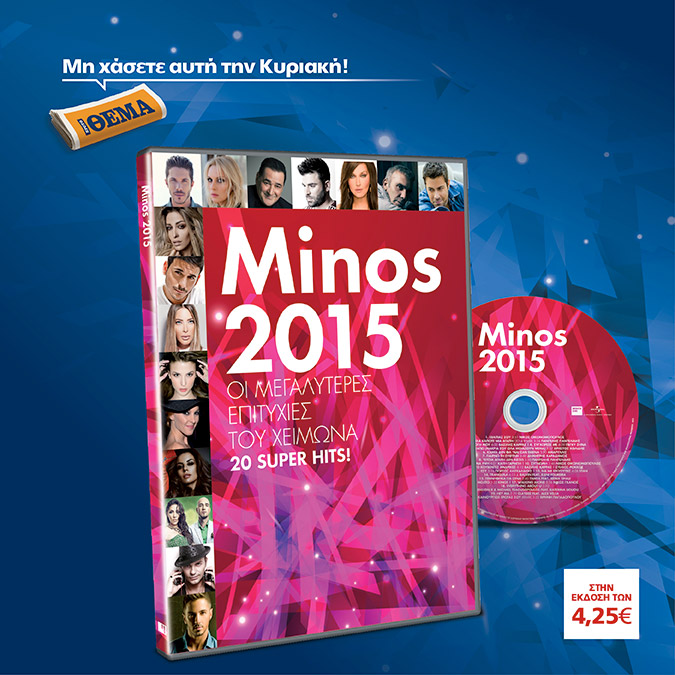Αυτή την Κυριακή η συλλογή “Minos 2015” συναντά το Πρώτο Θέμα! Οι 20 μεγαλύτερες και καυτές ελληνικές και ξένες επιτυχίες του φετινού χειμώνα θα βρίσκονται συγκεντρωμένες σε ένα cd αυτή την Κυριακή μόνο στο Πρώτο Θέμα στην έκδοση με τις προσφορές (4,25 ευρώ). Επιτυχίες όπως τα : “Εξαιτίας Σου” με τον Νίκο Οικονομόπουλο, “Είχα Kάποτε Μια Αγάπη” με τον Παντελή Παντελίδη, “Έπιλογή μου” με τον Βασίλη Καρρά, “Σ’αγαπώ (Μακριά σου όλα μοιάζουν ψέμα)” με τον Χρήστο Χολίδη, “Ανεμοδαρμένα Ύψη” με την Καίτη Γαρμπή, “Tranquila” J. Balvin Feat. Ελένη Φουρέιρα, “Mojito” με τους Kings, “Hey Ma” Claydee Feat. Alex Velea και πολλά ακόμη προσφέρονται συγκεντρωμένα σε αυτό το απόλυτο cd αποκλειστικά στους αναγνώστες του Θέματος. Αποκτήστε λοιπόν αυτή την Κυριακή το CD Minos 2014 με τα 20 super hits του χειμώνα!
