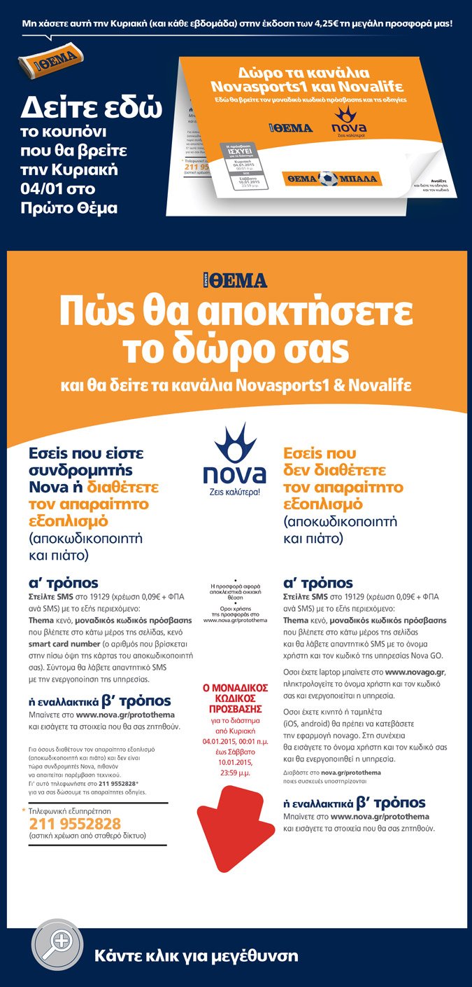 Η διαδικασία για να κάνετε χρήση της προσφοράς είναι απλή: Όσοι επιλέξουν την Κυριακή 4 Ιανουαρίου (και κάθε Κυριακή) το ΘΕΜΑ (στην έκδοση των 4,25 ευρώ) θα βρουν μια καρτέλα στην οποία αναγράφεται ένας κωδικός και οδηγίες σύνδεσης με την NOVA.