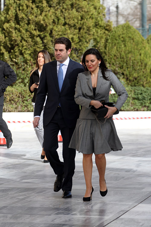 Η Όλγα Κεφαλογιάννη, «αρχοντική» όπως πάντα, επέλεξε να φορέσει σακάκι με βαθύ ντεκολτέ και κλος φούστα μέχρι το γόνατο, όλα σε γκρι τόνους. Τσάντα και γόβες στο απόλυτο μαύρο.