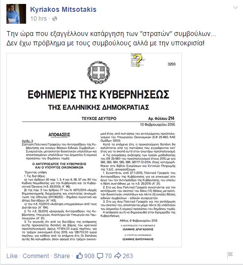 Κάτω από την ανάρτηση ο κ. Μητσοτάκης σχολίαζε: «Την ώρα που εξαγγέλλουν κατάργηση των "στρατών" συμβούλων. Δεν έχω πρόβλημα με τους συμβούλους, αλλά με την υποκρισία!».