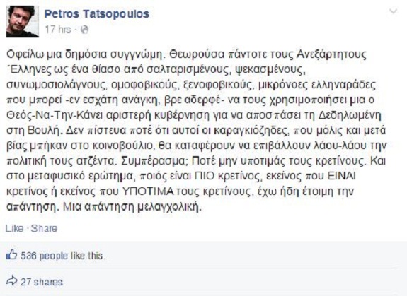 Σφοδρή επίθεση στους Ανεξάρτητους Ελληνες και την κυβέρνηση εξαπέλυσε ο πρώην βουλευτής και συγγραφέας, Πέτρος Τατσόπουλος, μέσω του προσωπικού του λογαριασμού του στο facebook.