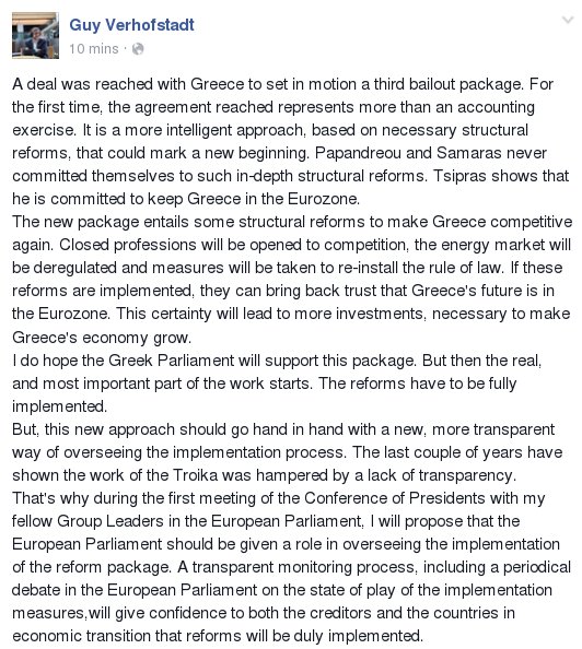 Ο πρώην πρωθυπουργός του Βελγίου και επικεφαλής των Φιλελεύθερων και Δημοκρατών, τόνισε στο μήνυμά του ότι Παπανδρέου και Σαμαράς δεν τόλμησαν επί των ημερών τους τέτοιου είδους μεταρρυθμίσεις, όμως επεσήμανε ότι το δύσκολο έργο τώρα ξεκινά για την Ελλάδα. «Ο Τσίπρας δείχνει ότι είναι αποφασισμένος να κρατήσει την Ελλάδα στην Ευρωζώνη», γράφει την ίδια ώρα, χαρακτηριστικά.
