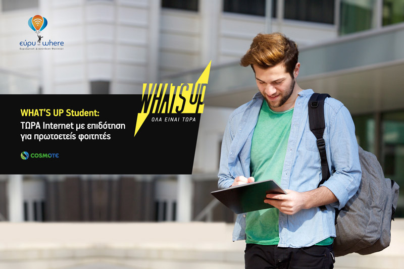 Στη Δράση «εύρυ-where», που αφορά στην παροχή ψηφιακών υπηρεσιών σε δικαιούχους προπτυχιακούς πρωτοετείς φοιτητές, συμμετέχει η COSMOTE με το WHAT’S UP Student, που προσφέρει αποκλειστικά φοιτητικά προϊόντα. Στο πλαίσιο της Δράσης, οι προπτυχιακοί πρωτοετείς φοιτητές ΑΕΙ, ΤΕΙ και των Ανώτατων Εκκλησιαστικών Ακαδημιών (ΑΕΑ) όλης της Ελλάδας, που εγγράφηκαν για πρώτη φορά το ακαδημαϊκό έτος 2016-2017, έχουν τη δυνατότητα να αποκτήσουν ή να διατηρήσουν σύνδεση στο Internet (σταθερή ή κινητή), με μηνιαία επιδότηση 3 ευρώ στο πάγιο, για 12 μήνες.