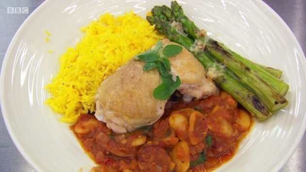 Η Οτιλιέ παρουσίασε στους κριτές ένα όμορφο πιάτο. Μπούτια κοτόπουλο με γλυκιά πατάτα, λευκά φασόλια, σαφράν, σπαράγγια και καπνιστό βούτυρο σκόρδου. Όλα τα είχε επιμεληθεί άψογα. Ξέχασε όμως να περιποιηθεί το βασικό συστατικό του πιάτου της.