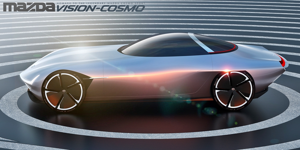 Το Vision-Cosmo υιοθετεί ένα κάπως παρόμοιο συνολικό σχήμα και αυτό είναι ιδιαίτερα εμφανές με την παρουσία καμπίνας με επικάλυψη σχεδόν αποκλειστικά από γυαλί, κάτι που σημαίνει πως οι επιβάτες θα έχουν πολύ φως στην καμπίνα και εξαιρετική περιφερειακή ορατότητα. Οι προβολείς LED και μια φωτεινή μπάρα που ταιριάζει περισσότερο στην τρέχουσα σχεδιαστική γλώσσα της Mazda, κοσμούν το μπροστινό μέρος, ενώ μια «αντανάκλαση» του παλιού Cosmo, γίνεται αντιληπτή στο πίσω μέρος, όπου τα πίσω φώτα με τεχνολογία LED (μαζί με το τρίτο φως για τα φρένα που είναι τοποθετημένο κάθετα στο πίσω μέρος) δίνουν μια ρετρό προσέγγιση. Σύμφωνα με το σχεδιαστή του, το Vision-Cosmo είναι υβριδικό, με τον κινητήρα εσωτερικής καύσης να είναι –φυσικά- Wankel και να χρησιμοποιείται μόνο ως range extender για την εν κινήσει φόρτιση των μπαταριών.