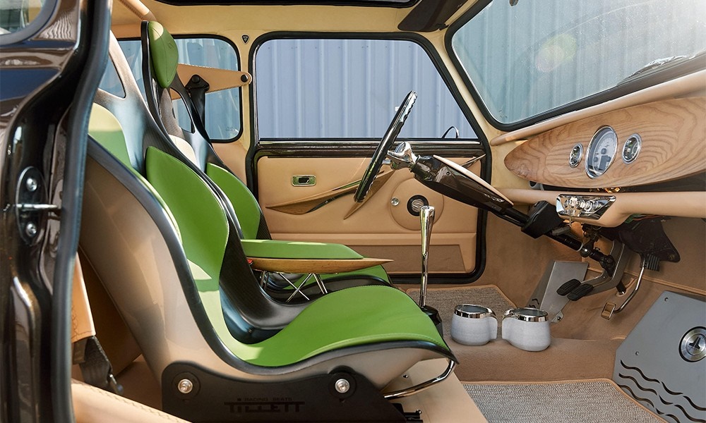 Στο εσωτερικό έχει διατηρηθεί η μίνιμαλ φιλοσοφία του αυθεντικού μοντέλου όπως και το κλασικό τιμόνι, όμως έχουν τοποθετηθεί ελαφριά τύπου μπάκετ καθίσματα και roll cage. Πίσω από τα καθίσματα έχει τοποθετηθεί ένας τετρακύλινδρος 2.0 VTEC K20 της Honda με 230 ίππους που κινεί τους πίσω τροχούς μέσω κιβωτίου 6 σχέσεων και διαφορικού περιορισμένη ολίσθησης. Φυσικά για την υποστήριξη μιας τέτοιας μετατροπής χρειάστηκε ο ριζικός ανασχεδιασμός της ανάρτησης όμως πέρα από αυτό το αυτοκίνητο έχει διατηρήσει τους μικροσκοπικούς τροχούς 10 ιντσών.