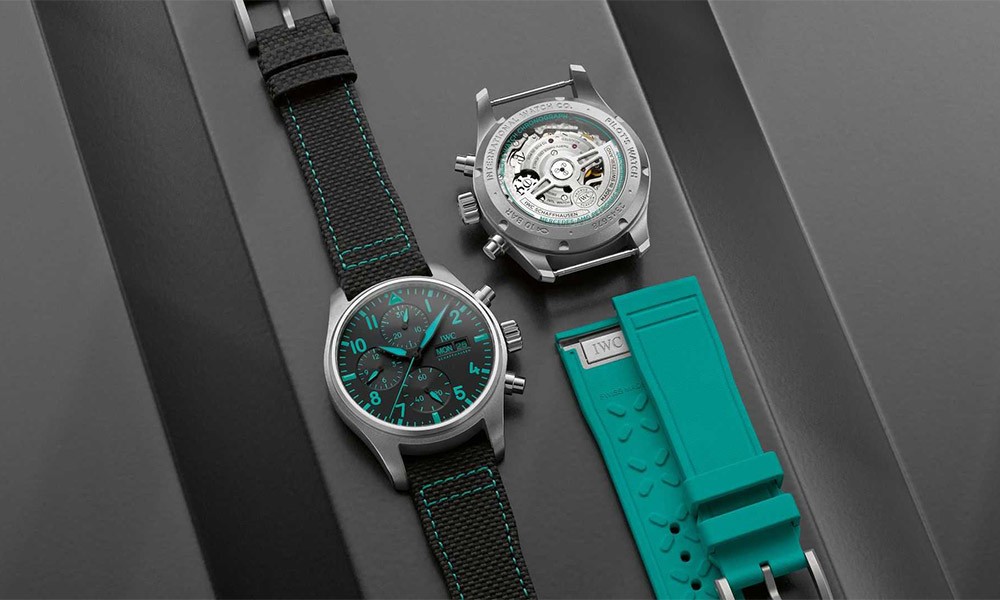 Υπάρχουν δύο διαθέσιμα λουράκια για το IWC Pilot’s Watch Chronograph 41 Edition Mercedes-AMG Petronas Formula One Team: Ένα μαύρο ανάγλυφο από δέρμα μοσχαριού και ένα πράσινο από καουτσούκ. Μέσω του συστήματος EasX-Change της εταιρείας, μπορούν εύκολα να αλλάξουν με το πάτημα ενός κουμπιού χωρίς πρόσθετα εργαλεία. Το Pilot’s Watch Chronograph 41 Edition Mercedes-AMG Petronas Formula One Team κοστίζει 7.745 ευρώ στην Ελβετία.
