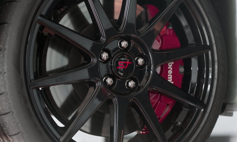 Η οροφή του Focus ST Track Pack, το άνω τμήμα της μάσκας και τα καλύμματα των εξωτερικών καθρεπτών διαθέτουν και αυτά το ίδιο γυαλιστερό μαύρο φινίρισμα. Παρόμοιο οπτικό εφέ διαθέτουν και οι ζάντες αλουμινίου, πίσω από τις οποίες διακρίνονται οι δαγκάνες των φρένων οι οποίες είναι βαμμένες σε κόκκινο χρώμα.