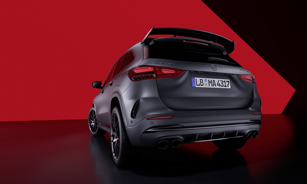 Στο πίσω μέρος της GLA 45 S 4Matic+, οι αλλαγές αφορούν στα φώτα, στον προφυλακτήρα και στον ενσωματωμένο διαχύτη, στις στρογγυλής διατομής διπλές απολήξεις της εξάτμισης και φυσικά στην αεροτομή που είναι τοποθετημένη στην οροφή του αυτοκινήτου.