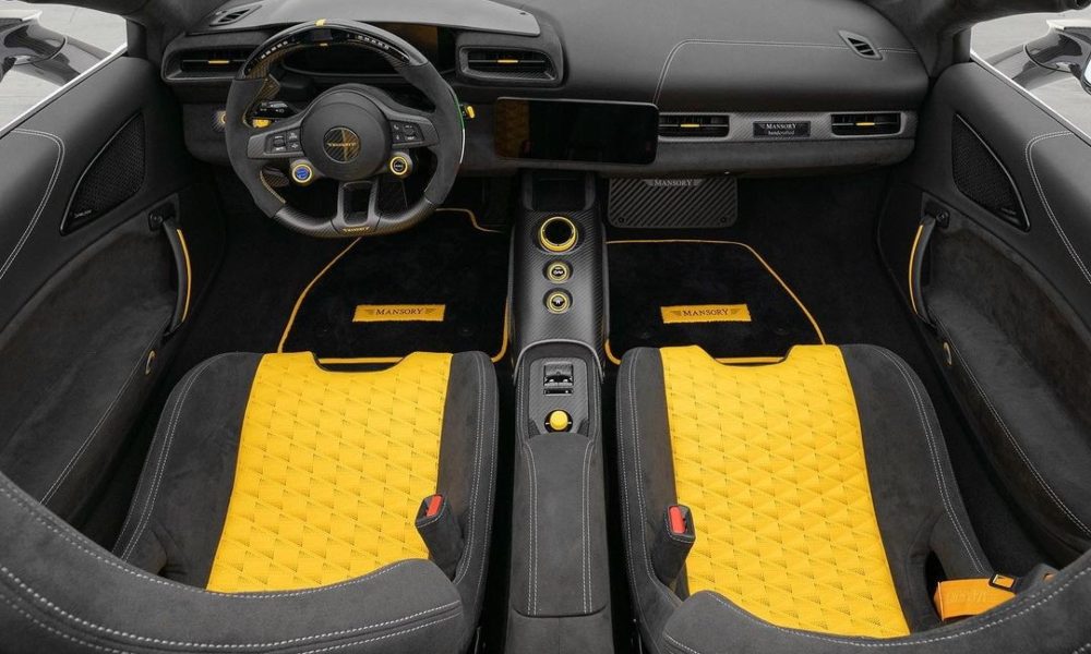 Η Mansory θεωρεί το έμβλημά της πιο πολύτιμο από το γνήσιο της μάρκας του αυτοκινήτου και για αυτό το αντικατάστησε για ακόμα μία φορά, βάζοντας το δικό της σε όλα τα καίρια σημεία. Στο εσωτερικό, η υπογραφή των Γερμανών είναι εμφανής σε πολλές εκφάνσεις, όπως στο κάθισμα, στις ζώνες, στο τιμόνι, στα πατάκια και ούτω καθεξής. Το κοκπιτ είναι δίχρωμο, κυρίως όμως μαύρο με κίτρινες λεπτομέρειες. Η ιταλική σημαία είναι ζωγραφισμένη πάνω στα «αυτάκια» των ταχυτήτων του τιμονιού και κάπου εκεί ολοκληρώνεται το makeover της MC20.