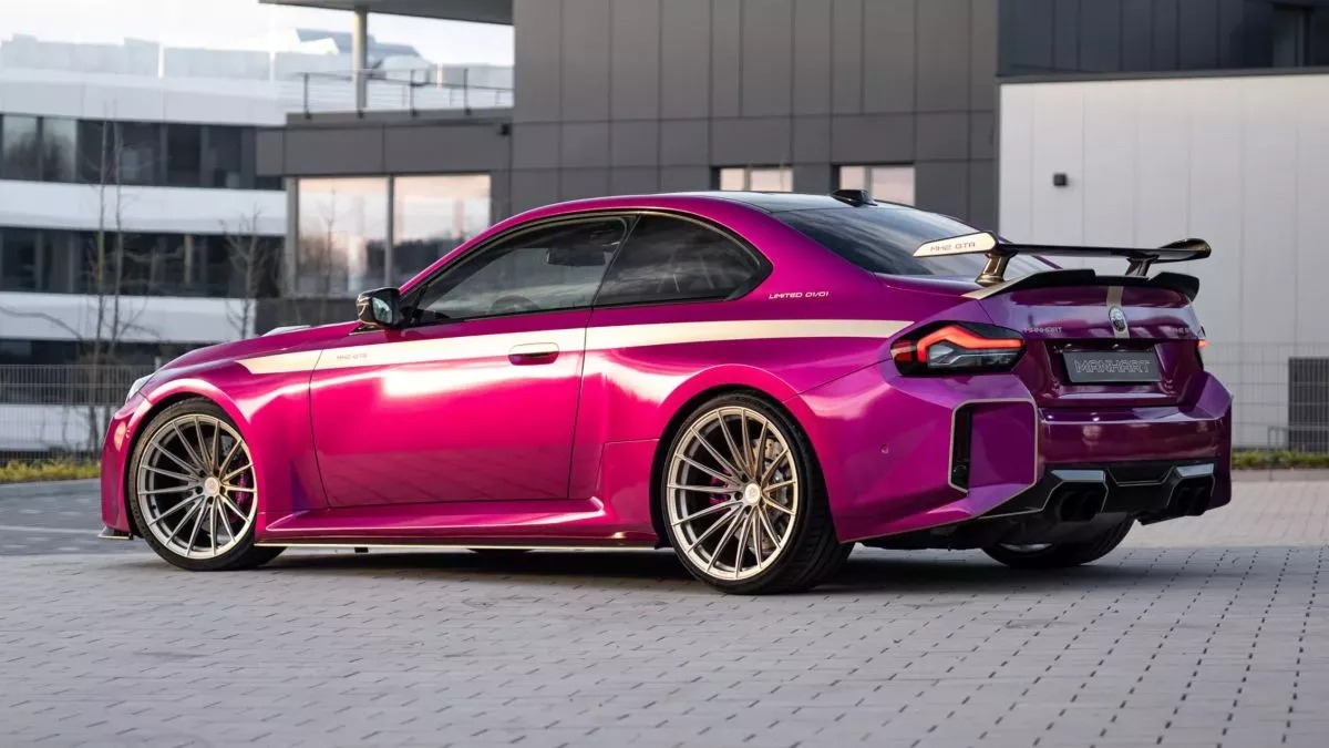 Στην όψη και μόνο, η MH2 GTR II μαγνητίζει με την ιδιαίτερη βαφή της, όπου το φούξια κυριαρχεί και συνδυάζεται με διακριτικά της Manhart.