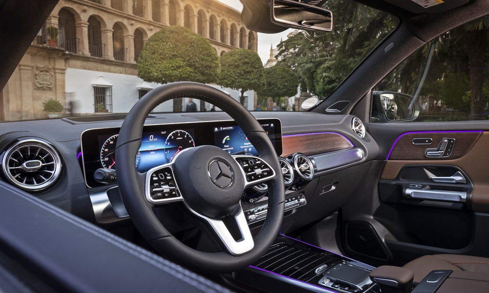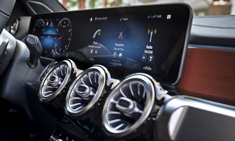 Η καμπίνα της νέας GLB, είναι ένα υπόδειγμα σύγχρονης σχεδίασης και εφαρμοσμένης τεχνολογίας. Το νέο μοντέλο οπτικά, δίνει το στίγμα της συγγένειας με την G-Class χάρη στους αεραγωγούς που –κυριολεκτικά- κοσμούν το ταμπλό. Το σύστημα ΜΒUX δίνει φυσικά και εδώ το παρόν και με τις λειτουργίες του, κάνει το κατά τα άλλα έως και μίνιμαλ εσωτερικό της GLB να φαίνεται ιδανικό για καθημερινή συμβίωση. Πολύ μεγάλο ρόλο παίζει η εξαιρετική ποιότητα συναρμογής των επιμέρους τμημάτων αλλά και η συνολική εικόνα του, που ταιριάζει σε high end σύνολο, δίνοντας νέα διάσταση στον όρο premium. Από τη θέση του οδηγού, τα πάντα είναι στη σωστή απόσταση για την απρόσκοπτη πρόσβαση σε όλες τις λειτουργίες. Η περιήγηση στο λειτουργικό του MBUX είναι τυπική για σύγχρονη Mercedes- σίγουρα θα απαιτήσει χρόνο εξοικείωσης από τον ιδιοκτήτη της αλλά όπως φαίνεται, από ένα σημείο και μετά, τα πάντα θα έρχονται χωρίς να χρειάζεται να πάρει τα μάτια του από το δρόμο. Οι μεγάλες οθόνες 10,25 ιντσών είναι το κυρίαρχο θέμα στο επάνω μέρος του ταμπλό (και αφού το μάτι ξεκολλήσει από τους πολύ όμορφους αεραγωγούς).