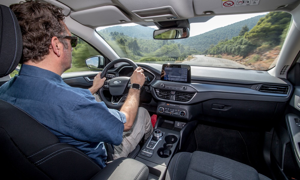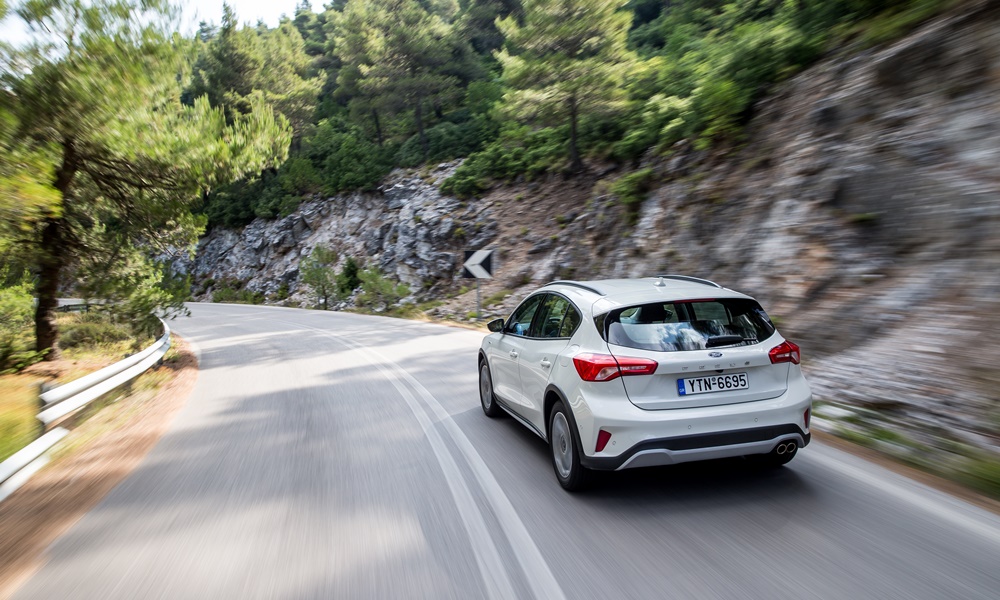 Τα καλύτερα όμως έρχονται από τη στιγμή που θα καθίσεις στη χαμηλή θέση του οδηγού, η οποία αποδεικνύεται ιδανική για κάθε σωματότυπο. Εκεί, με το τιμόνι να βρίσκεται στη σωστή θέση, με όλα τα χειριστήρια κοντά και εύκολα προσβάσιμα, την ώρα που ξεδιπλώνεται η οθόνη του head-up display, αρχίζεις να καταλαβαίνεις ότι αυτό εδώ το αυτοκίνητο δεν είναι ένα τυπικό οικογενειακό (και αδιάφορο οδηγικά) μοντέλο. Γίνεται σαφές πως η δυναμική οδική συμπεριφορά εξακολουθεί να είναι το βασικό του όπλο. Η στιβαρή αίσθηση που μεταφέρει στον οδηγό και η αμεσότητα στις αντιδράσεις του το κάνουν εξόχως οδηγοκεντρικό. Το εξαιρετικά ζυγισμένο πλαίσιο σε κάνει να ξεχνάς το αυξημένο κέντρο βάρους και να επιτίθεσαι σε διαδρομές με συνεχείς καμπές επειδή ξέρεις ότι εκεί το Focus Active θα δώσει τον καλύτερό του εαυτό. Σε αυτό βοηθά πολύ και το σύστημα Enhanced Transitional Stability το οποίο παρακολουθώντας την ταχύτητα του οχήματος και τις εντολές του οδηγού στο τιμόνι προβλέπει έγκαιρα την όποια απώλεια πρόσφυσης και ενεργοποιεί το ESP συντομότερα, προς όφελος της ασφάλειας και της οδηγικής άνεσης.