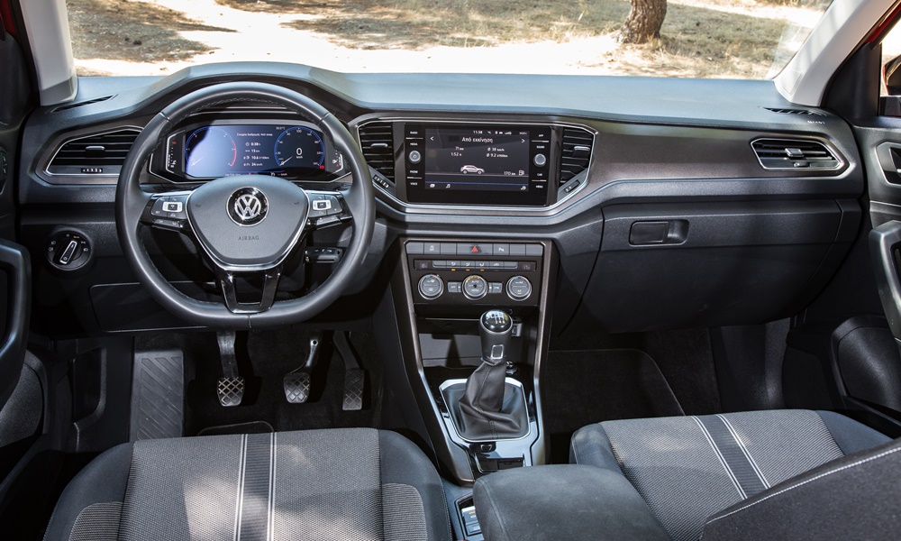 Στο εσωτερικό, ο πλήρως ψηφιακός πίνακας οργάνων, Active Info Display, σε συνδυασμό με το σύστημα infotainment συνθέτει ένα προηγμένο, ψηφιακό και διαδραστικό cockpit. O οδηγός θα βρει εύκολα την ιδανική θέση οδήγησης, ενώ οι υπόλοιποι επιβάτες θα εκτιμήσουν την άνεση των χώρων του T-Roc. Η συνολική ποιότητα κατασκευής είναι πολύ καλή, αλλά εξακολουθούμε να έχουμε ενστάσεις για την εκτεταμένη χρήση σκληρών πλαστικών (ειδικά στα πάνελ των θυρών), τα οποία αφενός δείχνουν φθηνά και αφετέρου δεν γνωρίζουμε πώς θα αντιδράσουν στο πέρασμα των ετών. Ο χώρος αποσκευών προσφέρει συνολικά 445 lt ενώ οι διαιρούμενες 60/40 πλάτες των πίσω καθισμάτων μπορούν να αναδιπλωθούν ώστε να δημιουργηθεί ένας επίπεδος χώρος φόρτωσης που φτάνει τα 1.290 lt. H ηχομόνωση κυμαίνεται σε πολύ καλά επίπεδα φιλτράροντας ικανοποιητικά τον θόρυβο που παράγεται από τον αέρα και την κύλιση αλλά και από τον κινητήρα.