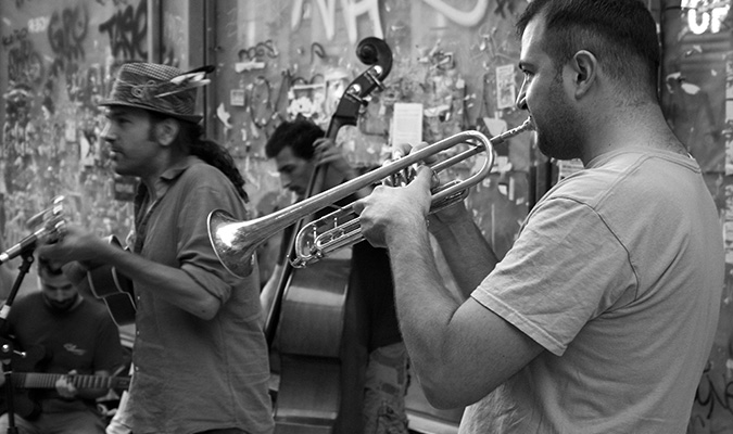 Στη διάρκεια του οδοιπορικού μου πρόσεξα ότι ένα από τα πιο δημοφιλή μουσικά κομμάτια που ακούγονται στους αθηναϊκούς δρόμους είναι το κλασικό Girl From Ipanema, ενώ εντυπωσιάστηκα με μια ερμηνεία που άκουσα στο Μοναστηράκι του -επίσης χιλιοτραγουδισμένου- Summertime, συνοδεία βιολιού! Ένα άλλο απόγευμα, κι ενώ βρισκόμουν μέσα σε βαγόνι του μετρό, ένας νεαρός με μια κιθάρα άρχισε να παίζει και να τραγουδάει το αγαπημένο «Δίχτυ» με ένα τόσο άψογο τρόπο και πραγματικά υπέροχη φωνή που έκανε τους επιβάτες να σταματήσουν να μιλούν και να γυρίσουν προς το μέρος του καθώς εκείνος προχωρούσε με αργά βήματα ανάμεσά τους.
