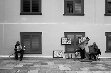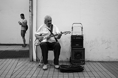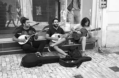 Ο Γιώργος, που παίζει κιθάρα στις γειτονιές του Κέντρου, και τον οποίο πλησίασα, λέει ότι μέχρι πριν από λίγα χρόνια έπαιζε σε ένα μικρό γκρουπ φίλων του, σε ταβέρνες και μικρές γιορτές, αλλά τώρα προσπαθεί να βγάλει ένα μεροκάματο στον δρόμο. Οι ταβέρνες μείωσαν τις βραδιές με τους μουσικούς, άλλες έκλεισαν, το γκρουπάκι τους διαλύθηκε, όπως μου λέει, και έτσι αναγκάστηκε να ακολουθήσει αυτήν την εναλλακτική λύση. Είναι ταλαντούχος, κάτι που εύκολα διακρίνουν οι περαστικοί, όπως επίσης και μια κυρία που συνήθως παίζει φλάουτο σε είσοδο του μετρό.