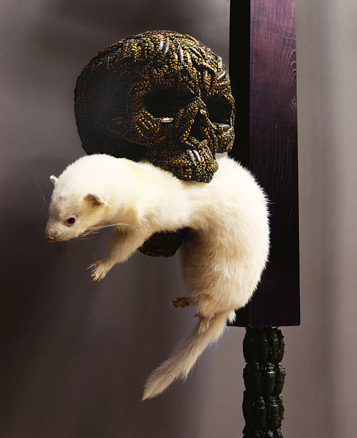 Αυτό όμως που έχει κάνει τις φιλοζωικές οργανώσεις να εξαγριωθούν είναι ο τρόπος που έχει «μεταχειριστεί» ένα κουνάβι. Πρόκειται για το έργο ferret (οικόσιτη νυφίτσα ή κουνάβι) το οποίο δείχνει το ζώο εγκλωβισμένο στο στόμα ενός κρανίου.
