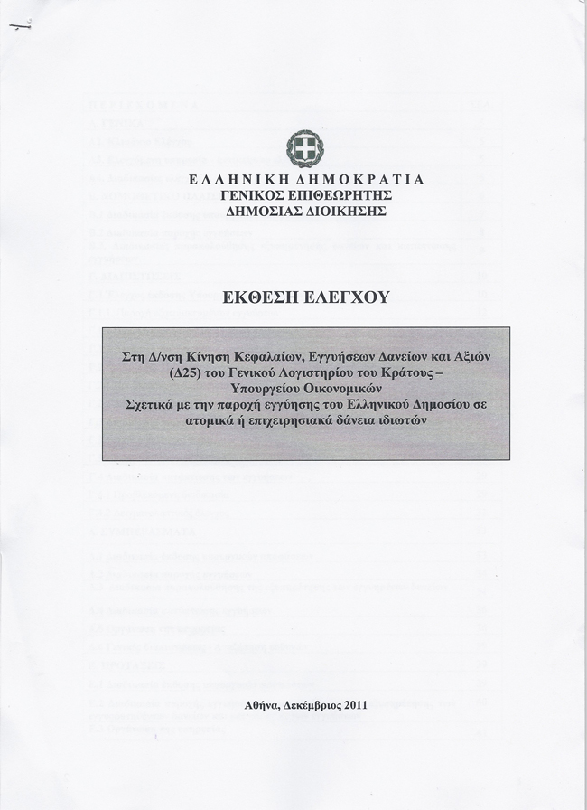 Στις 43 σελίδες του πορίσματος που ολοκληρώθηκε τον Δεκέμβριο περιγράφεται όλο το σαθρό σύστημα παροχής των εγγυήσεων, ενώ «φωτογραφίζονται» και οι ευνοημένοι του συστήματος, που απομυζούν το Δημόσιο. Εξετάζονται οι όροι υπό τους οποίους το κράτος «πετούσε σωσίβιο» σε ιδιώτες με ατομικά ή επιχερησιακά δάνεια, ενώ απέκλειε εντέχνως κάποιους άλλους από κάθε βοήθεια.