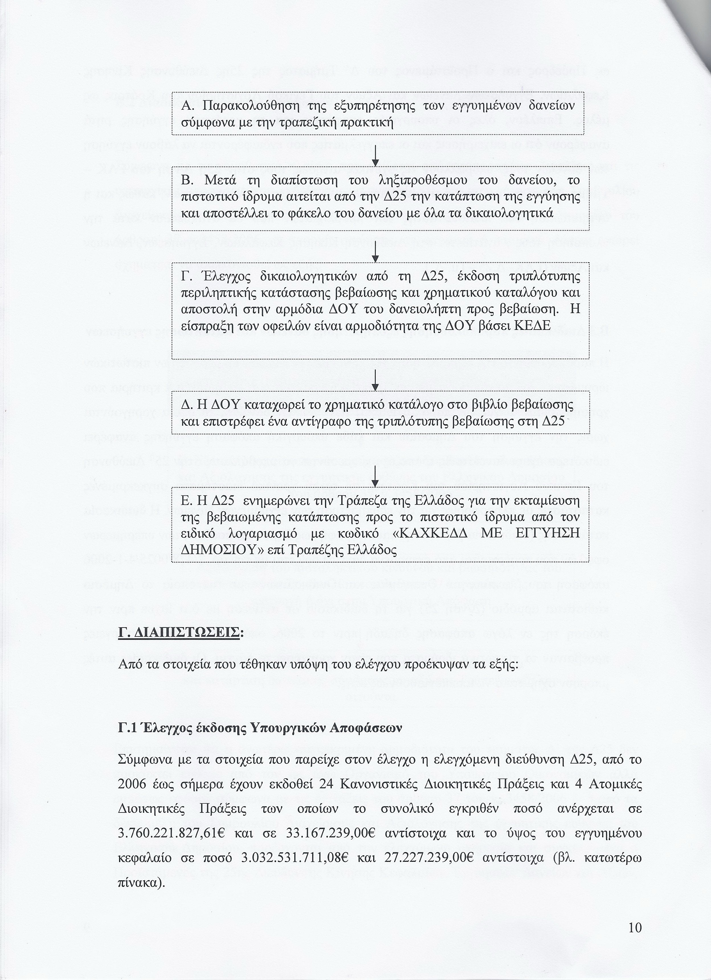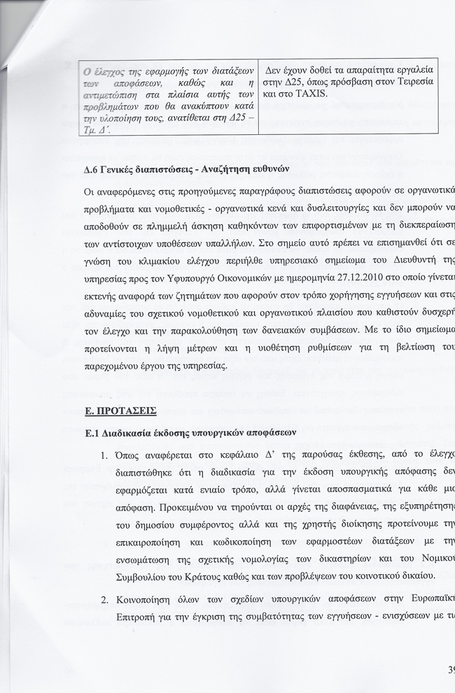 - Υπουργικές αποφάσεις λαμβάνονται χωρίς να έχει προηγηθεί οικονομοτεχνική μελέτη βιωσιμότητος των επιχειρήσεων που επωφελούνται, «με αποτέλεσμα να δημιουργούνται αμφιβολίες με το κατά πόσο η ρύθμιση στοχεύει στην κάλυψη πραγματικών αναπτυξιακών αναγκών ή απλώς στην παράταση του χρόνου κατάπτωσης της παρασχεθείσας εγγύησης, από την οποία μάλιστα ωφελείται κυρίως το εμπλεκόμενο πιστωτικό ίδρυμα, μέσω της είσπραξης των επιπλέον τόκων».