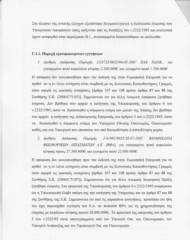 Για παράδειγμα, ο δειγματοληπτικός έλεγχος των Επιθεωρητών έδειξε ότι την ώρα που το υπουργείο Οικονομικών εξασφάλιζε δανεια ύψους πχ 1.760.000 ευρώ στην ΠΑΕ ΠΑΟΚ, 22 εκατ. στη Βιομηχανία Φωσφορικών Λιπασμάτων κλπ κλπ, αρνείτο να εγρκίνει δάνεια για αγρότες και επιχειρήσεις της Κρήτης, προβάλλοντας σαν «μπαμπούλα» για την άρνησή του, την αυστηρή κοινοτική νομοθεσία. Την ίδια ώρα όμως, το ίδιο το υπουργείο απέφευγε να δώσει στην Κομισιόν για έλεγχο, τις αποφάσεις για τα δάνεια που είχε ήδη εγκρίνει!