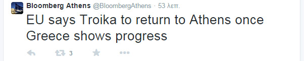 Όπως μετέδωσε το Bloomberg Athens, επικαλούμενο πηγές των Βρυξελλών, «η Ευρωπαϊκή Ένωση λέει ότι η Τρόικα θα επιστρέψει, όταν η Αθήνα δείξει πρόοδο».