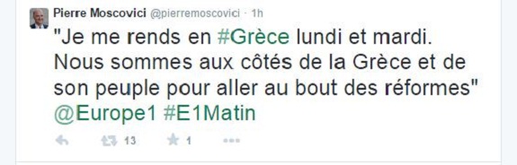 «Πιστεύω ότι ο Αντώνης Σαμαράς για να επιλέξει την επίσπευση της εκλογής Προέδρου της Δημοκρατίας έχει εμπιστοσύνη στη δυνατότητα να υπάρξει επιτυχής ολοκλήρωση αυτής της διαδικασίας στις δύο επόμενες εβδομάδες», είχε δηλώσει, άλλωστε, μετά το Eurogroup της Δευτέρας, ο κ. Μοσκοβισί, δείχνοντας την εμπιστοσύνη του προς την ελληνική κυβέρνηση. Αυτό ακριβώς φαίνεται πως θέλει να δείξει με την επικείμενη επίσκεψή του στη χώρα μας.