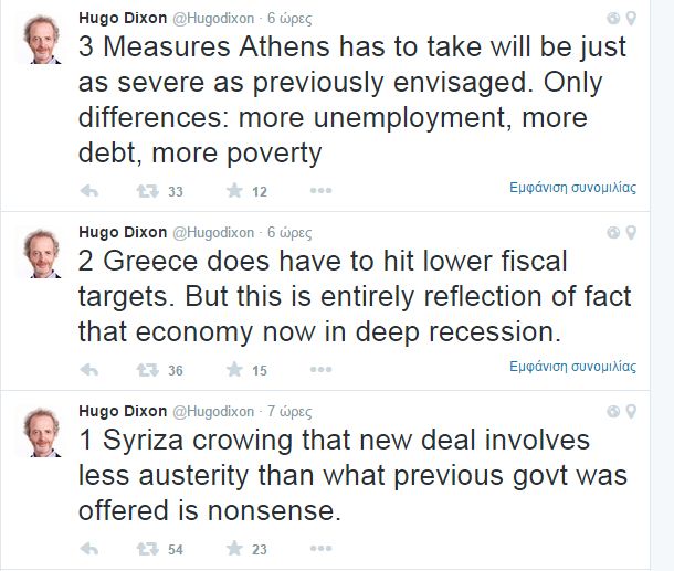«Οι ισχυρισμοί του ΣΥΡΙΖΑ ότι η καινούργια συμφωνία προβλέπει λιγότερη λιτότητα από αυτή της προηγούμενης κυβέρνησης είναι ανοησίες», γράφει χαρακτηριστικά ο Ντίξον στην πρώτη του ανάρτηση.
