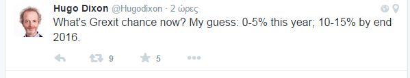 Τέλος, ο γνωστός αρθρογράφος ανέφερε σε τέταρτη ανάρτηση, σύμφωνα με τις εκτιμήσεις του, οι πιθανότητες για Grexit διαμορφώνονται σε 0-5% αυτή χρονιά και σε 10-15% μέχρι το τέλος του 2016.
