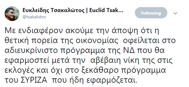«Με ενδιαφέρον ακούμε την άποψη ότι η θετική πορεία της οικονομίας οφείλεται στο αδιευκρίνιστο πρόγραμμα της ΝΔ που θα εφαρμοστεί μετά την αβέβαιη νίκη της στις εκλογές και όχι στο ξεκάθαρο πρόγραμμα του ΣΥΡΙΖΑ που ήδη εφαρμόζεται» έγραψε στο Twitter ο υπουργός Οικονομικών