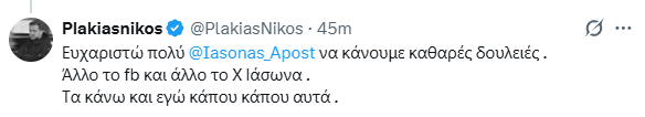 Ο Ιάσων Αποστολόπουλος απάντησε στον Ν. Πλακιά λέγοντας ότι δεν φοβάται να απαντήσει στην κυρία Καρυστιανού και έκανε την ανάρτηση και στο X.