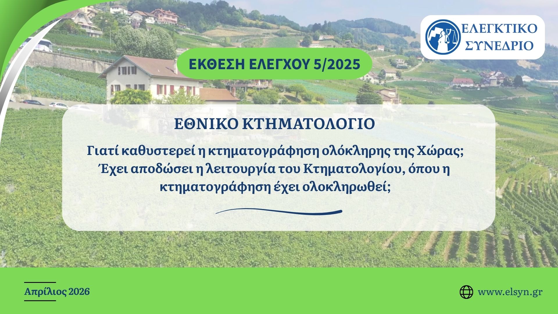 «Το Ελεγκτικό Συνέδριο δημοσιεύει σήμερα την Έκθεση Ελέγχου 5/2025: Εθνικό Κτηματολόγιο: «Γιατί καθυστερεί η κτηματογράφηση ολόκληρης της Χώρας; Έχει αποδώσει η λειτουργία του Κτηματολογίου, όπου η κτηματογράφηση έχει ολοκληρωθεί;»