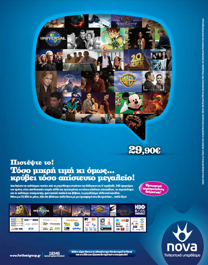 Ο Όμιλος Forthnet θέτει, για άλλη μια φορά, νέα δεδομένα στον τομέα της ψυχαγωγίας, με μια νέα super προσφορά: το πλούσιο τηλεοπτικό θέαμα της Nova, για όλη την οικογένεια, σε πολύ προσιτή τιμή.