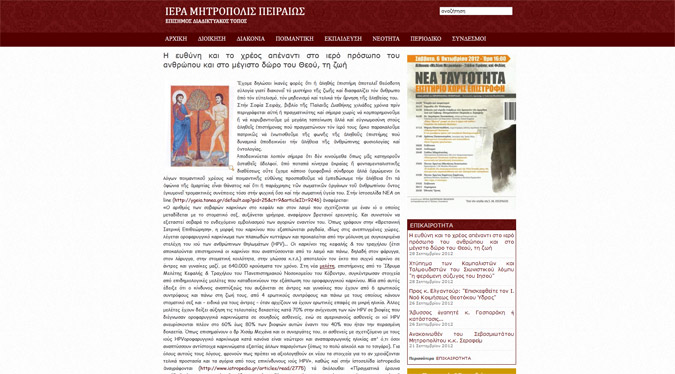 Στο μανιφέστο αυτό κατά του στοματικού έρωτα που αναρτήθηκε στην ιστοσελίδα της Ιεράς Μητροπόλεως Πειραιώς με τίτλο «Η ευθύνη και το χρέος απέναντι στο ιερό πρόσωπο του ανθρώπου και στο μέγιστο δώρο του Θεού, τη ζωή», ο Άγιος Πειραιώς αξιοποιεί ρεπορτάζ που δημοσιεύθηκε το 2010 στην ιστοσελίδα της εφημερίδας τα νέα για τους κινδύνους από τον στοματικό έρωτα.