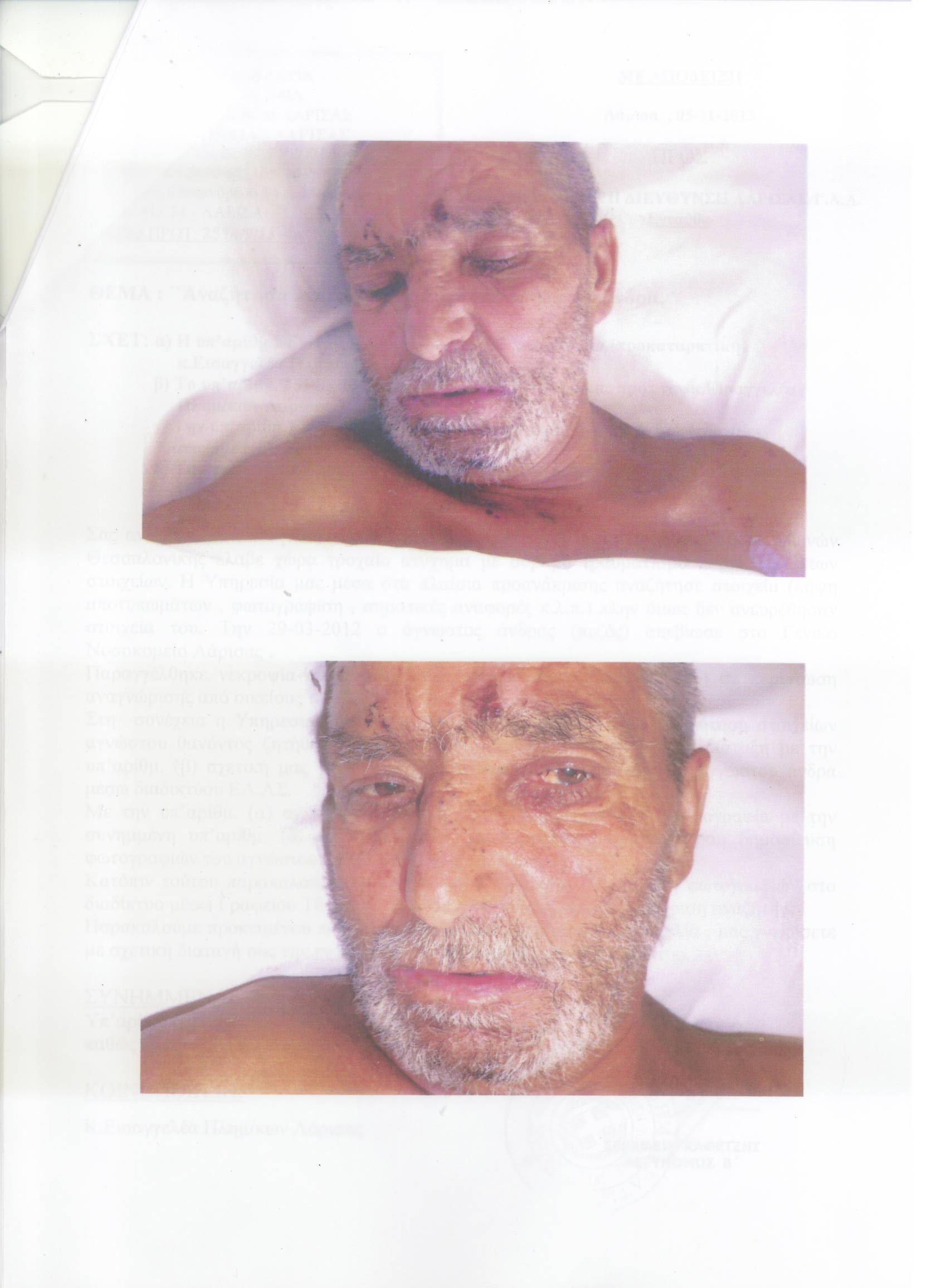 Με εντολή του εισαγγελέα Πλημμελειοδικών Λάρισας, δόθηκαν στη δημοσιότητα δύο φωτογραφίες οι οποίες ελήφθησαν κατά το διάστημα της νοσηλείας του άτυχου άνδρα, που είχε παρασυρθεί από αυτοκίνητο στο 353ο χιλιομέτρου της παλιάς εθνικής οδού Αθηνών– Θεσσαλονίκης.