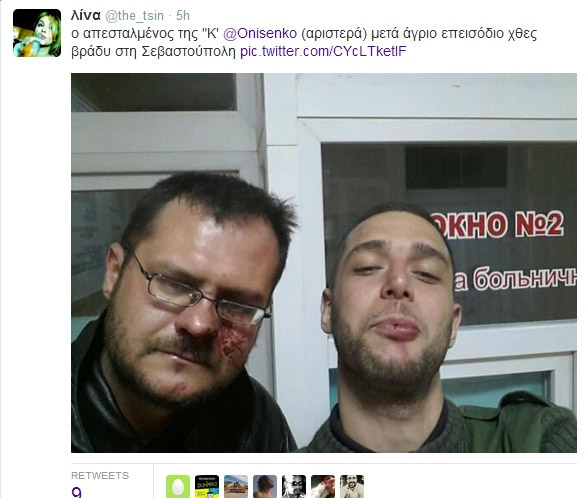 Φωτογραφία που δείχνει τον ανταποκριτή της «Καθημερινής» στην Κριμαία, Κώστα Ονισένκο, έπειτα από τον τραυματισμό του από ένοπλους ρωσόφονους δημοσίευσε στον λογαριασμό της στο twitter η @the_tsin