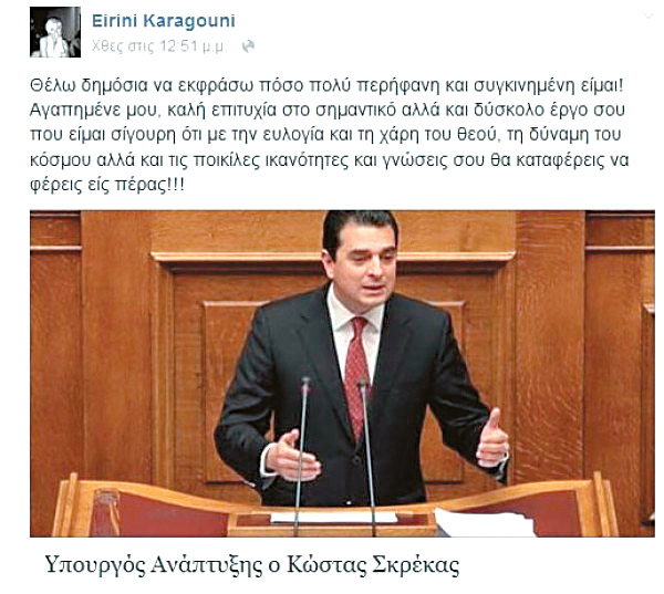 Στην εποχή των social media όλοι δικαιούνται επικοινωνιακά κάποια εφήμερη δημοσιότητα. Ετσι, η κυρία Ειρήνη Καραγκούνη-Σκρέκα δεν αρκέστηκε στην παρουσία της κατά την ορκωμοσία του 41χρονου συζύγου της Κώστα Σκρέκα ως νέου υπουργού Ανάπτυξης. Του ευχήθηκε «καλή επιτυχία» μέσω της προσωπικής της σελίδας στο Facebook, εκδηλώνοντας δημόσια την περηφάνια και τη συγκίνησή της.