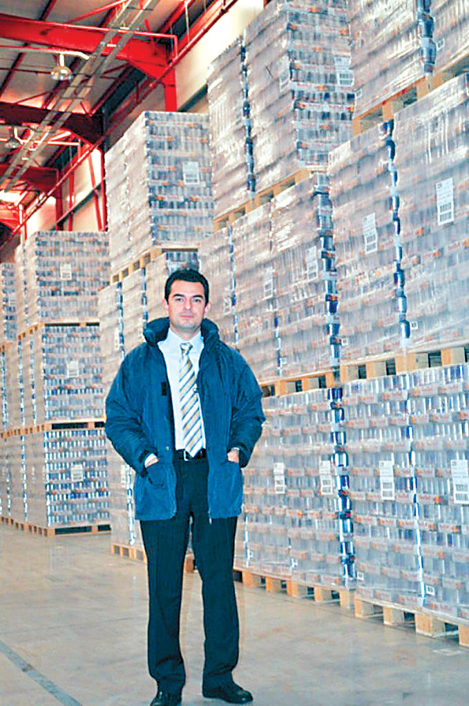 O κ. Κώστας Σκρέκας ποζάρει στις αποθήκες της εταιρείας του μπροστά από τις παλέτες με το γνωστό ποτό που εισάγει και διακινεί στην Ελλάδα