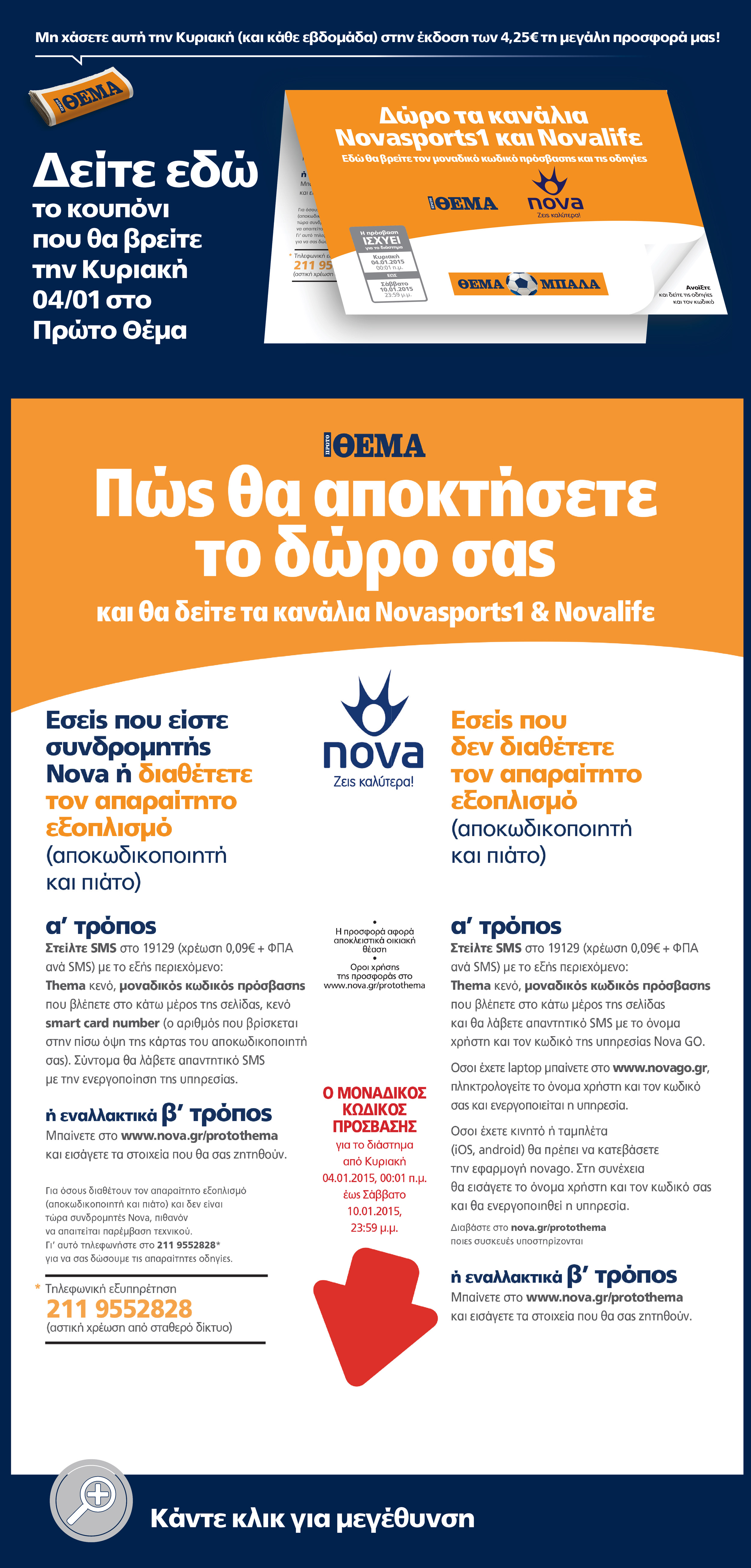 Η διαδικασία για να κάνετε χρήση της προσφοράς είναι απλή: Όσοι επιλέξουν την Κυριακή 4 Ιανουαρίου (και κάθε Κυριακή) το ΘΕΜΑ (στην έκδοση των 4,25 ευρώ) θα βρουν μια καρτέλα στην οποία αναγράφεται ένας κωδικός και οδηγίες σύνδεσης με την NOVA.