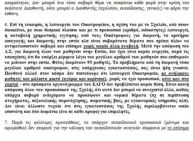 Στο συγκεκριμένο απόσπασμα της επιστολής, αναφέρεται χαρακτηριστικά: «Η λειτουργία του Οικοτροφείου, η σχέση του με το Σχολείο, από ποιον διοικείται, με ποιο θεσμικό πλαίσιο και με τι προσωπικό (αριθμό, ειδικότητες) λειτουργεί, η καταβολή χρηματικής εγγύησης από τους Οικότροφους για διαμονή, τα κριτήρια εισαγωγής και διαμονής στην εστία κλπ είναι σοβαρότατα θέματα που πρέπει πλέον να αντιμετωπιστούν σοβαρά και επίσημα χωρίς καμία άλλη αναβολή.