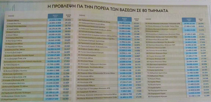 Πίνακας με τις προβλέψεις για 80 τμήματα