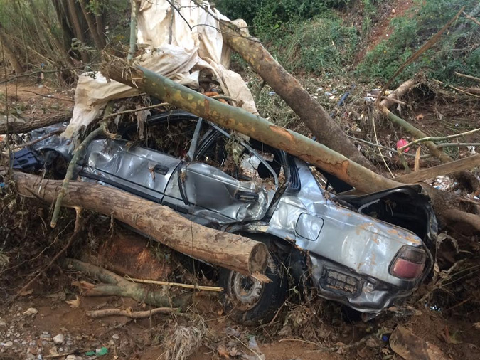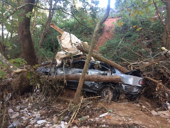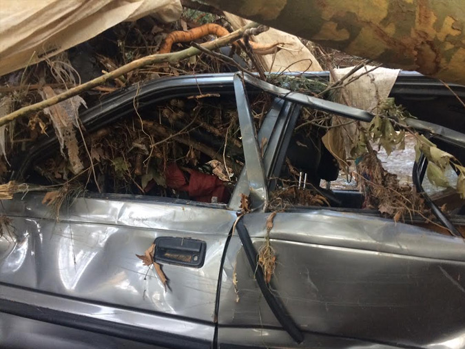 Οι παρακάτω εικόνες είναι απλά τρομακτικές. Το όχημα βρέθηκε παγιδευμένο μέσα σε κορμούς δέντρων και καταπλακωμένο, με τα τζάμια σπασμένα και τις λαμαρίνες του χίλια κομμάτια, ενώ η ανέλκυσή του είναι αδύνατη, καθώς το σημείο είναι εξαιρετικά δύσβατο.
