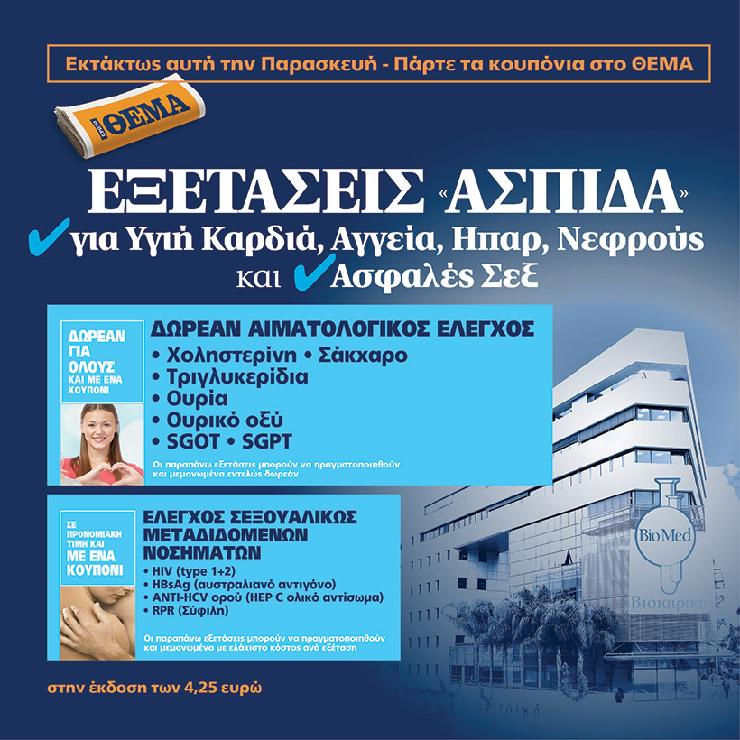 ü Πάρτε το κουπόνι που θα βρείτε στην πρώτη σελίδα της εφημερίδας, στην έκδοση με τις προσφορές (4,25 ευρώ) και που αντιστοιχεί στις εξετάσεις που θέλετε να κάνετε. Για να πραγματοποιήσετε τις εξετάσεις σας είναι υποχρεωτική η προσκόμιση του σχετικού κουπονιού στη Βιοιατρική, την ημέρα που θα κάνετε τις εξετάσεις.